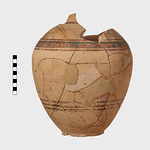 | Description: | Handles and practically everything above shoulder missing. Fabric and decoration as P 10185 (Φ 411). ADDENDA P 10185: On shoulder: concentric semicircles, between which two vertical zigzag lines. Body reserved, except for broad black band between narrower ones, below semicircles, and three narrow black bands lower on body. | |