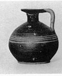 | Description: | Lip chipped. Squat, flat-bottomed jug with short narrow neck and flaring round mouth. Vertical band handle. Dull black glaze with four reserved bands below handle attachment; vertical band down handle, and rings on upper face of lip. | |