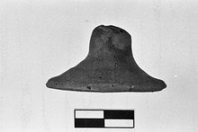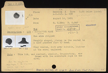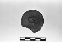| Description: | One side chipped. Roughly shaped, rising in the center to a knob pinched flat by hand. Clay coarse, dark gray outside, lighter at the core; unglazed. Miniature Votive Lid. | |
