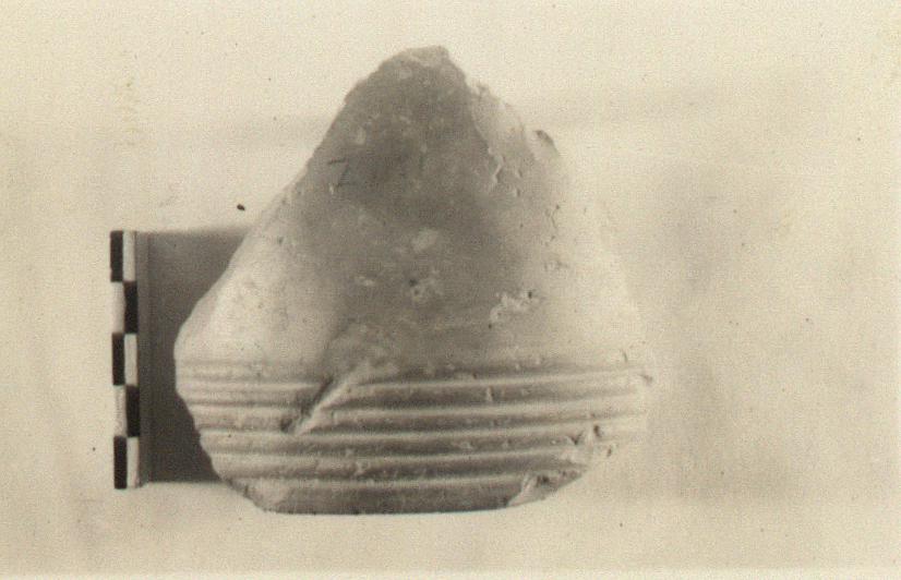 | Description: | Fragment from wall and base. Low broad base ring; six bands of horizontal reeding around lower side wall. Black glaze inside. | |