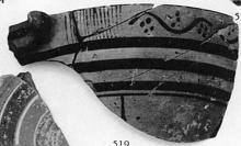 | Description: | Fragment from upper wall and rim with part of one handle. Rim rabbeted to receive lid. In rim panel a wavy line with dot rosettes in waves. Panel closed toward handles by groups of vertical bars. Below the panel, three broad and one narrow band. Around the base, rays. Handles spurred. | |