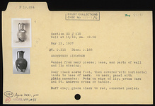 | Description: | Mended from many pieces; base, and parts of wall and lip missing. Body black above foot, then covered with horizontal bands to base of neck. On neck, panel with plain maeander. Dots on edge of lip; crossbars and St. Andrew's cross on handle. Buff clay; glaze black to red, somewhat peeled. | |