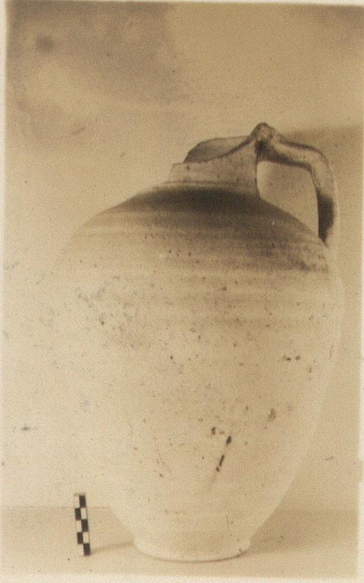 Description:   Part of neck missing. Ring foot and ovoid body; short neck and projecting lip ridged on top. One handle.