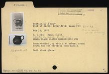 | Description: | Round-bodied jug with flat bottom; round mouth and one vertical band handle. Dull black glaze. | |