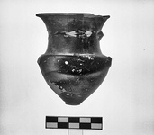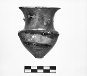 | Description: | Foot and handles missing. Pointed lower body and high concave rim. Vertical handles, shoulder to half way up rim. Wreath in terracotta paint on rim front and back, at point of upper handle attachment. Thin black glaze, somewhat grayed. | |