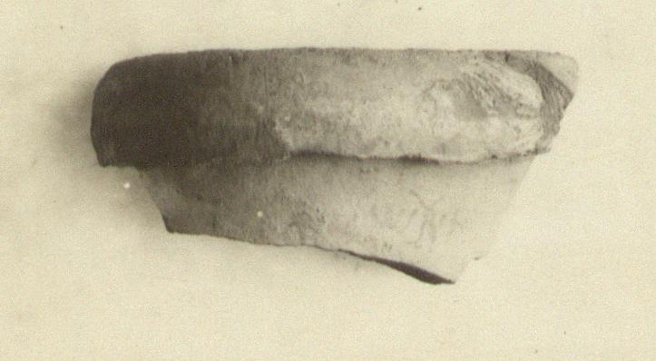 | Description: | Mouth fragment. Heavy rolled lip, projecting on the outside. Inscribed, in black ink, on neck just below rim: <graphic> Deep pink clay with bits. | |