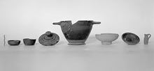 Context:   Deposit of black glazed pottery between scarp and garage pit 1.