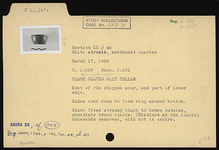 | Description: | Most of rim chipped away, and part of lower edge. Sides come down to form ring around bottom. Glaze fired streaky black to brown outside, chocolate brown inside (distinct at rim inside). Underside reserved with dot in center. Cf. Agora XII, no. 908. | |