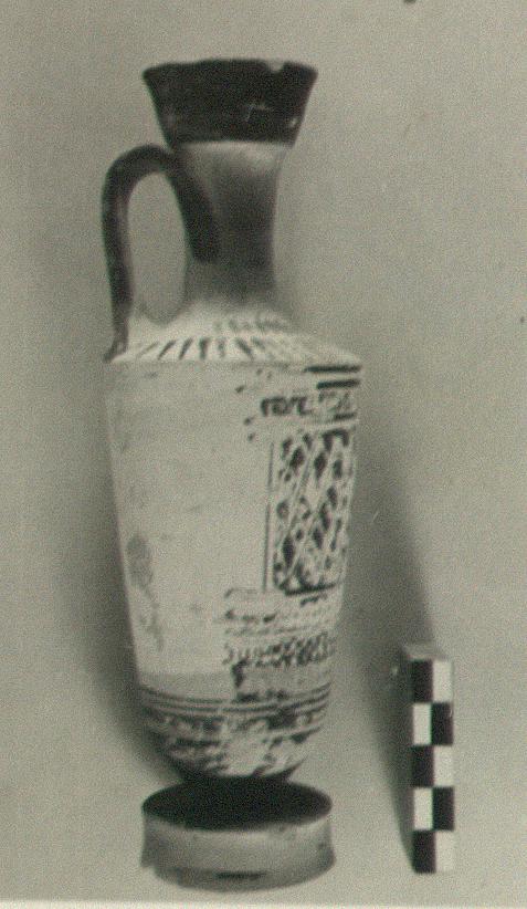 | Description: | Pattern across front in black glaze. Broad latticed band, above which stripes and a maeander, stripes, grill work. Cf. P 10339, Beldam Painter. | |