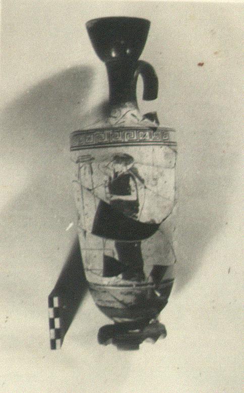 | Description: | Small fragments of shoulder, walls and foot missing; mouth and neck black; black below scene worn. In the neck, an inset, which alone could be filled from the mouth: H. 0.057 from neck down; Diam. 0.031; Th. of walls ca. 0.003. Flat bottom, left rough. At base of neck, egg pattern; three palmettes with tendrils on shoulder. Above scene, maeander broken by dotted X-squares. Reserved line below scene. A youth and a woman face each other at a stele; the youth, standing at the left, is nude, and holds a strigil in his left hand. On the wall behind him hangs an aryballos. The woman wears a purple chiton; in her left hand she holds an alabastron; with her right she clasps the top of her head. On the wall behind her, a cloth with strings (sakkos?). The plain stele rests on three steps, and is topped by a simple moulding, just below which are tied fillets, one red and one brown. Firm glaze drawing (not relief lines) shading to brown; light brown for her hair. Publ. ca. 440 B.C. | |