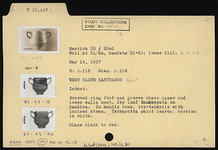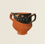Description:   Intact. Grooved ring foot and groove where upper and lower walls meet. Ivy leaf thumb-rests on handles. In handle zone, ivy tendrils with incised stems. Terracotta paint leaves; berries in white.