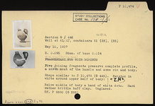 Description:   Five joining fragments preserve complete profile, a sixth most of the handle and some rim and body. Shape similar to P 10473 (Φ 445). Below middle of body, a band of white dots.