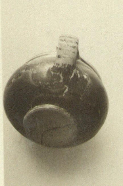 | Description: | Fragmentary; about one-quarter of the lip and the body wall preserved. Small flat base, unglazed beneath; bulging body; small vertical lip; band handle from lip. Two reserved stripes around the outside of the lip; one on the top, and one on the inside. Glaze stripes on reserved handle. Pinkish-buff clay. Firm black glaze. The fragments of the upper parts of several similar cups may be found in the boxes from this pit. | |