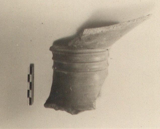 | Description: | Part of floor and of high flaring base only. Three rings at top of base. Gray clay and surface. Middle Helladic. | |