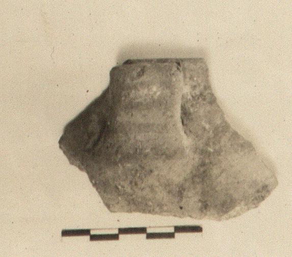 | Description: | Fragment of wall and lip of a pot, with sharp shoulder, flaring lip and small broad vertical handle. Coarse red clay; heavy fabric. Outside, traces of light slip and dark bands on handle and hatchings on shoulder. Middle Helladic. | |