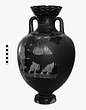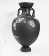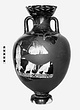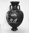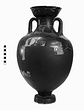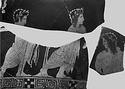 | Description: | Many fragments preserve most of the lip, both handles, the base and much of the wall. Restored in plaster. Panathenaic shape. Flaring echinus lip; small handles, below lip to shoulder; plain foot flat on top; ring around neck. Around outer face of lip, olive wreath, the leaves reserved, the berries white; two palmettes, vertically opposed, at each of the lower handle attachments. Below the figures, band of maeander broken by checkerboard squares. No trace of division into panels: side walls missing below shoulder. A) Procession of four(?) youths, moving right; parts of three preserved, space at the right for a fourth, missing. In the center, a slender tree with laurel-like leaves and white berries. The youths are wreathed, and, in so far as preserved, clad alike in full himatia variously draped. The first and second figures have long hair curling to their shoulder; of the third the top of the head only remains. The second figure looks back toward the first; between them is a shallow tray(?) which they appear to be carrying, held low. Inscribed over and just in front of the head of the first figure: <graphic>; of the third, ΧΡΣ[ B) The procession continues: three youths, right, similar to those on A, their hair respectively long and curly, short, and lanky. The figure at the left carries a large amphora on his shoulder, steadied by his right hand. He looks back to the left. Written from just above the amphora, the inscription: <graphic> Relief contour for profiles and napes; some brown details and drapery shading. White for the berries of the wreaths and presumably for the inscriptions, of which now only the stain remains. | |