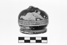 Description:   Small squat lekythos; neck, mouth and handle missing. Ring foot. On front of body, child, crawling right and playing with three balls(?). Child nude save for an amulet string which passes over the left shoulder and under the right arm.
