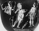 | Description: | Many joining fragments preserve about two-thirds of the circumference of the vase, and part of the rim. Filled out with plaster; nothing of the base preserved. A) Four standing figures: a bearded male; a woman in chiton and stephane, holding a long banded scepter; a youth with chlamys, travelling hat and short staff (top missing; possibly cadeuceus); a second youth, wreathed, with folded cloak over arms, and a long laurel branch in his left hand. (Possibly Zeus, Hera, Hermes and Apollo?) Rocky ground line indicated by light incisions over glaze; between the two youths, a plant. Relief contour for profiles and napes; some brown inner drawing; white, yellowed over, for the ribbon which ties Apollos' wreath, and for the berries on the laurel spray. B) Three cloaked figures (the central one missing except for his staff). No contours. Laurel wreath on rim; egg and dot around handles; double palmette ornament between handles and beneath; lower border, on A, dotted checkerboards; on B, dotted X-squares. | |