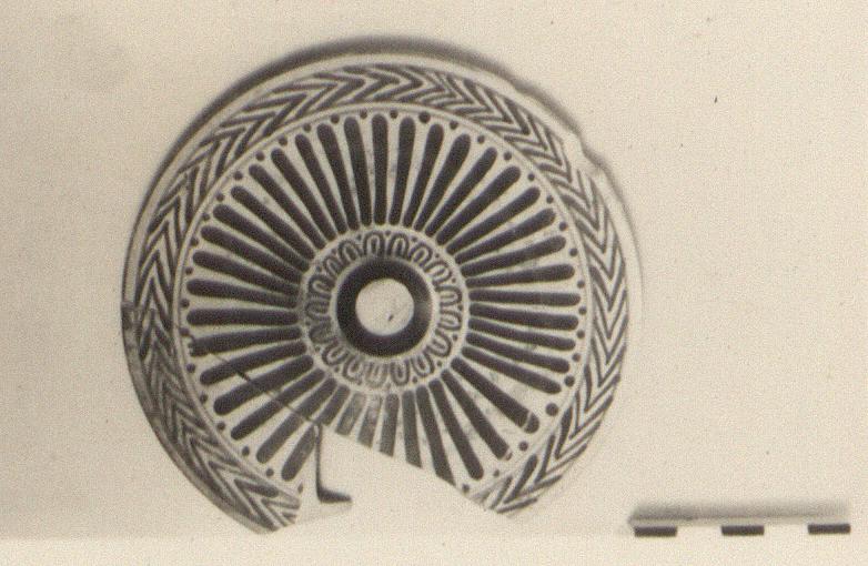 | Description: | The knob handle and about one-third of the rim broken off. Around the handle, egg pattern; below tongues dotted at the end, and around the edge herringbone. Flanged underneath; the concave curve from the edge of rim to edge of flange glazed, and a broad band of glaze inside. | |