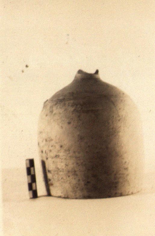 | Description: | Mouth and handle broken away. Flat bottom; cylindrical body with rounded shoulder. Grooves at base of neck, at shoulder, and at lower handle attachment. Between the grooves, scratched on shoulder in dry clay: <graphic> Buff clay; plain. Cf. Related to P 16319, P 11942 and comparanda. A possible human figure lightly scratched on the wall below (JWH). | |