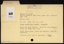 | Description: | About one-half remains. Open bowl with flaring sides and false base ring. Incised in dry clay on underside: <graphic> Flaky black glaze; black and reserved rings on underside. | |