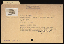 | Description: | Fragment from small convex cover tile, with flaky brown glaze on outside. Lightly scratched in dry clay on outside: <graphic> | |