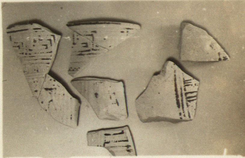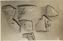 | Description: | Six non-joining pieces, five from the neck and one from the wall; rim with sloping top surface preserved. Decoration starting at top; maeander; narrow band of vertical lines set between zones of three horizontal lines; row of dancing women. Stroke series on upper face of rim. Pinkish-buff clay. Paint mostly gone. | |