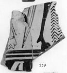 | Description: | Fragment from lower part of band of grazing horses, right. At left, head of one horse, then the tail and back leg of next at right, with horizontal zigzag filling ornament beyond the leg. Three horizontal bands below the figured zone, then the top of a zone of interlocking rays(?) as on P 10620 (ΘΘ 260). Head, mane and tail in outline; hoof outlined in added white. Pinkish clay, buff slip; brown to black glaze. | |