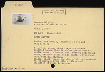 | Description: | Bottom, one handle, fragments of rim and wall missing. Lower body glazed black, with two narrow reserved bands; then irregular glazed bands to handle zone. In handle zone, between horizontal bands, vertical bands beside handles; front and back, vertical zigzags. Inside, black glaze, the edge of the lip reserved on one side, not the other. Glaze dull. Imitation of Proto-Corinthian. | |