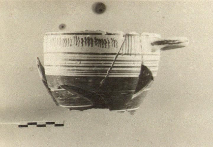 | Description: | Bottom, one handle, fragments of rim and wall missing. Lower body glazed black, with two narrow reserved bands; then irregular glazed bands to handle zone. In handle zone, between horizontal bands, vertical bands beside handles; front and back, vertical zigzags. Inside, black glaze, the edge of the lip reserved on one side, not the other. Glaze dull. Imitation of Proto-Corinthian. | |