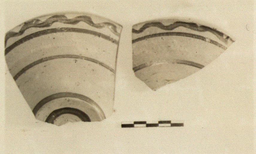 | Description: | Two non-joining pieces. Restored in plaster. Flat bottom, flaring wall, rim thickened on outer edge. Inside glazed except for reserved line just above the middle. Top of rim reserved, with stroke series. Outside unglazed, decorated with horizontal bands; wavy below rim, then three plain, to bottom, and one on bottom. Pinkish-buff clay, shiny red to brown glaze. | |