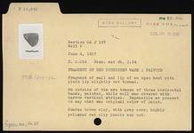 | Description: | Fragment of wall and lip of an open bowl with plain lip slightly out-turned. On outside of rim are traces of three horizontal bands, painted; wall was covered with narrow vertical stripes. Impossible at present to say what was original color of paint. Coarse brown clay, with gray core; highly polished red slip inside and out. Red Burnished Ware. | |