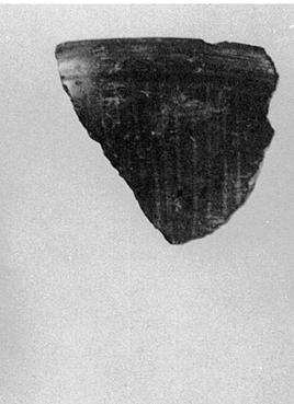 | Description: | Fragment of wall and lip of an open bowl with plain lip slightly out-turned. On outside of rim are traces of three horizontal bands, painted; wall was covered with narrow vertical stripes. Impossible at present to say what was original color of paint. Coarse brown clay, with gray core; highly polished red slip inside and out. Red Burnished Ware. | |