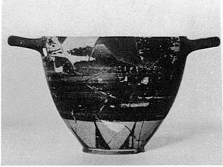 | Description: | Fragments of rim and bottom; one handle and much of the other missing. Ring foot with rays above. Body covered inside and out with dull glaze; black to brown, and somewhat peeled. Above rays and below handle zone, wide purple band bordered with white. In handle zone a white dot rosette beside each handle attachment, and one at the center. A white line at the edge of the lip outside; a purple band inside. Attic. | |