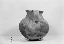 Description:   Fragments of body missing. Rather squat round body, rounded on the bottom. Round flaring mouth and wide band handle, lip to shoulder.
