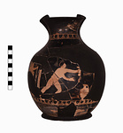 | Description: | Wall fragment, mended from four pieces; egg and dot pattern below. Brown wash inside. Nude youth running right, carrying a torch-racer's torch in his extended left hand; a hydria on the ground in front of him; part of some object at the extreme right. Coarse relief contour for profile and nape; white with traces of yellow over, on the handguard. Glaze dull and smeary. ADDENDA Additional fragments added to allow restoration in plaster. | |