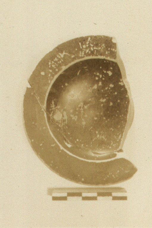 | Description: | Shallow bowl on very broad ring foot; broad projecting rim, flat on top. Black glaze over all; somewhat chipped. | |