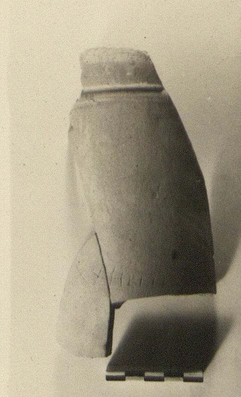 | Description: | Fragment of neck of unglazed amphora, part of rim preserved, plain, with a well marked groove and ridge below it. Additional fragments added Nov 1948 give the amphora complete from lip to shoulder. Plain lip, slightly convex in profile, set off from neck by ridge and groove. Arched handles. Upper body incurved sharply from shoulder. Graffito around outside: <graphic> Reddish-buff micaceous clay with traces of light buff slip. Cf. P 28446. | |