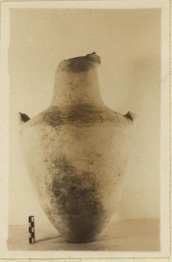 | Description: | Both handles and mouth broken off, hole in shoulder. Pointed body, ending in a concave truncation; fine grooves around shoulder. In red on shoulder: <graphic> Pinkish-buff clay with white grits and buff surface. | |