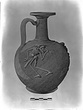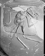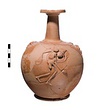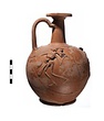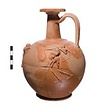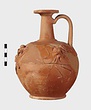 Description:   Fragments of body and lip, and most of handle missing. Ring foot and round body. Narrow neck, tapering upward, and flat projecting round lip, grooved inside. Grooved band handle from below lip to shoulder, ending in an applied leaf on the body. Raised ring below lip; raised band, groove, and ring of raised dots around shoulder. In applied relief on body, right; two grotesque goblins and a skeleton dancing; the goblins from the same mould.