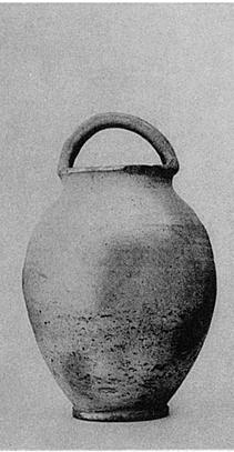 | Description: | Intact. Early neckless variety, with flaring mouth; ring foot. Handle grooved. Buff clay with grits; light slip. | |