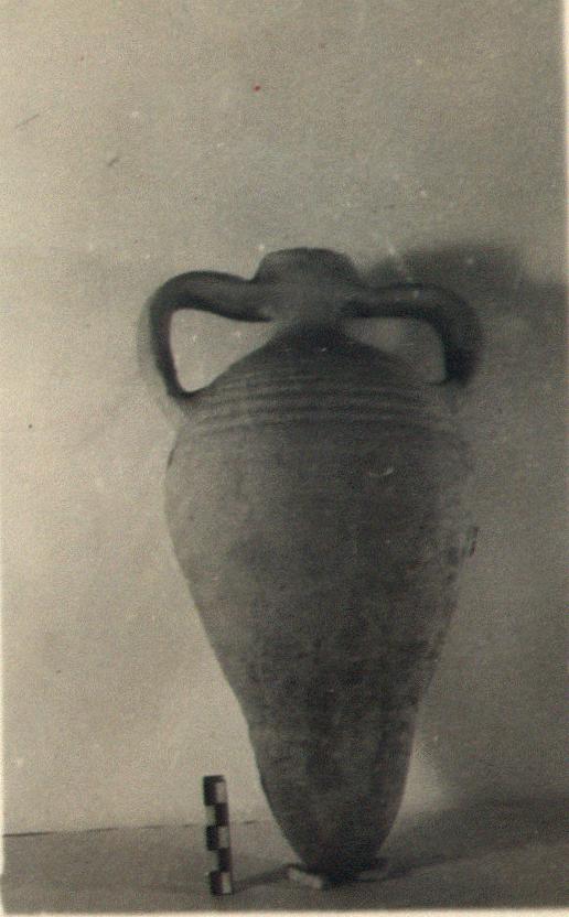 | Description: | Intact. Pointed jar with widely projecting band handles; body ribbed. Graffito on shoulder: <graphic> Buff clay. | |