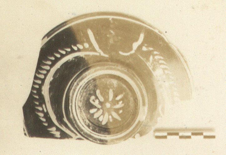 | Description: | All of rim and part of top missing. Restored in plaster. Heavy low ring-knob. Neat circular depressions on underside at center; the lid can be reversed and used as a fish plate. Decoration of garlands, carelessly rendered; a rosette inside the knob; all yellow and white. Scraped grooves around top and side of knob, top and edge of lid. Black glaze somewhat reddened. Cf. P 6288, P 6302. | |