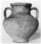 | Description: | Intact. Low flat base; plump body with slightly concave shoulder; wide straight neck; small projecting torus lip, flat on top. Band handles, below lip to shoulder. Buff clay; pale buff slip. | |