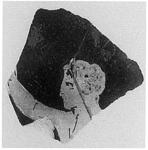 | Description: | From wall of small vase of thin fabric. Head of a youth, right, with right arm upraised. Sketchy work. Pinkish buff clay; glaze, inside and out, thin and flaky. | |