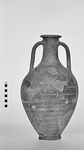 | Description: | Ring foot; projecting, slightly downsloping lip; band handles from below lip to shoulder. Much mended, and in part restored in plaster; fragments missing from the walls. On the bottom, inside, can be seen the drops of black glaze wash which splashed down when the rim was being painted. Fabric coarse but thin; fired pinkish around the bottom. | |