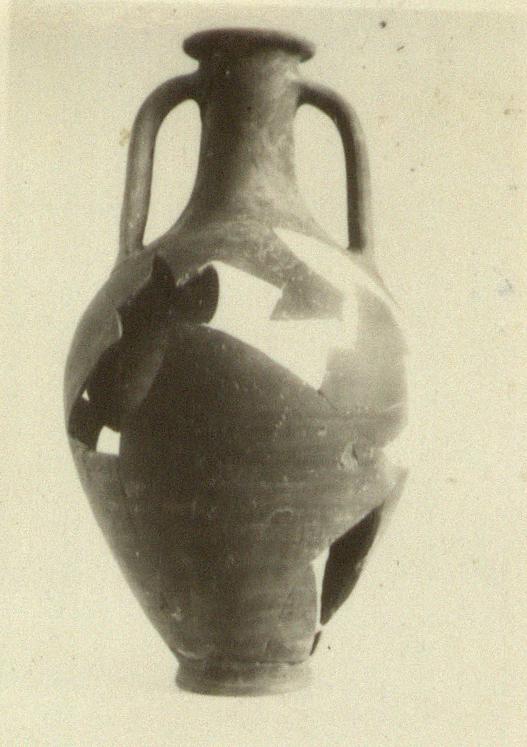 | Description: | Ring foot; projecting, slightly downsloping lip; band handles from below lip to shoulder. Much mended, and in part restored in plaster; fragments missing from the walls. On the bottom, inside, can be seen the drops of black glaze wash which splashed down when the rim was being painted. Fabric coarse but thin; fired pinkish around the bottom. | |