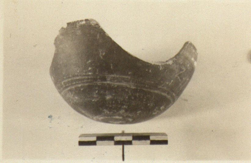 | Description: | Small flattened circle on base. Around mid-wall, a pair of grooves. On the floor inside, a grooved circle and another just below the rim with the glaze scratched from its bottom. Dull black glaze inside and out. | |