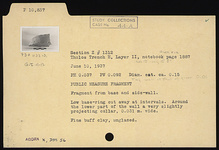 | Description: | Fragment from base and side wall. Low base ring cut away at intervals. Around the lower part of the wall a very slightly projecting collar, 0.031m. wide. Fine buff clay, unglazed. | |