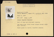 | Description: | Part of base and side wall remains. Low base ring; three broad ridges around lower wall outside. Black glaze on inside; reserved outside. | |